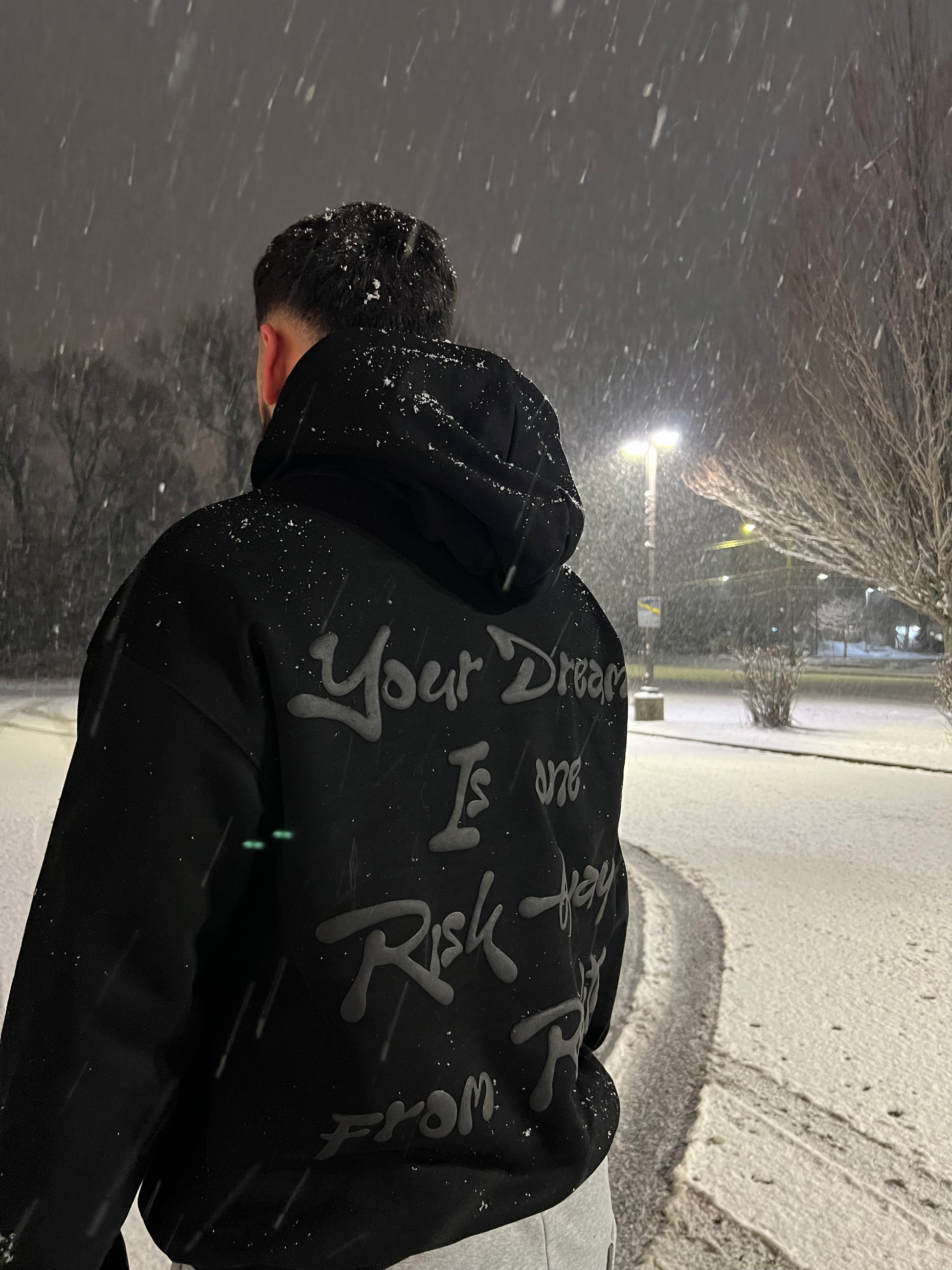 The back features a bold motivational message, "Your Dream Is One Risk Away from Reality," brought to life with an eye-catching puff print. On the front, our iconic "Solez" logo adds a touch of luxury with chenille embroidery, offering a textured, standout look. For an extra touch of detail, the sleeve features "SLZ", tying the design together with a subtle yet stylish nod to the brand.